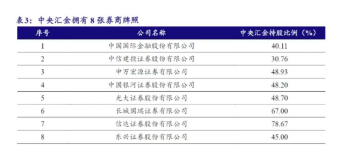 中央汇金目前持有8张券商牌照,包括持有中金公司40.11%股份、中信建投30.76%股份、申万宏源证券48.93%股份、中国银河48.20%股份、光大证券48.70%股份、长城国瑞证券67.00%股份、信达证券78.67%股份,以及东兴证券45.00%股份,在证券领域的资本布局与行业影响力进一步凸显。